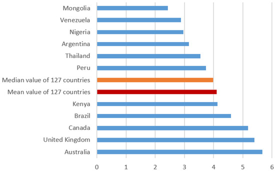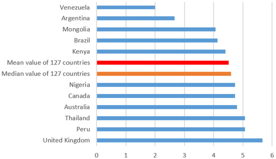Figure 2 reports the stringency of environmental regulations and enforcement of the 11 respective countries in which our sample firms are working. Comparing the median and mean values of 127 countries reveals that the values for Mongolia, Venezuela, Nigeria, Argentina, Thailand, and Peru are lower than the mean and median values. Therefore, we classified these six countries as lax environmental countries. The values for Kenya, Brazil, Canada, the United Kingdom, and Australia are higher than the mean and median values. Therefore, we classified these five countries as strict environmental countries. Canada, the UK, and Australia have always been known for very strict environmental regulations. The UK enacted the first modern environmental regulation, the Clean Air Act, as early as 1956, and this law formed an important impetus to modern environmental legislation. Kenya and Brazil vigorously promote green development and have increased their degree of environmental legislation and enforcement in recent decades. Their efforts address environmental degradation [48] and have gradually narrowed the gap between their environmental approaches and those of advanced economies. However, the environmental regulations of Argentina, Mongolia, Venezuela, Nigeria, Peru, and Thailand demonstrate a lower level of stringency, and the enforcement is often crippled by corruption and a lack of monitoring.