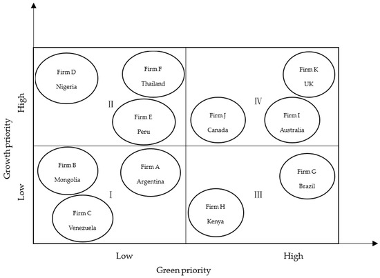 Quadrant IV (upper right) exhibits the kind of green governance context for countries that put a high premium on foreign investment and environmental protection simultaneously. Countries in this cell are more likely to have highly advanced economies, such as the United States (US), the United Kingdom, Australia, and Canada. On the one hand, they compete actively and have incentives to attract FDI [147]. On the other hand, they are used to having high levels of environmental laws and standards and tend to take a proactive approach to environmental protection [148]. A small number of countries in this cell, such as the United Kingdom and Canada, have some of the most stringent environmental regulations in the world. The stylized typology outlined in Figure 4 indicates that the green governance context can be differentiated within a broad spectrum associated with FDI policy and environmental regulation dimensions. However, our cluster analysis in Figure 1 indicates that the two extreme categories (e.g., high green priority/low growth priority and low green priority/high growth priority countries) are very sparsely populated. Most of the countries seem to be located within a moderate area for both the green priority and growth priority. This highlights the possibility that our chosen dimensions may be interdependent. Indeed, the history of countries’ development is a testament to the fact that governments often strategically set environmental regulatory standards to attract investment [10] or use environmental regulations to keep foreign investors away. This conjecture opens up an interesting area for future research that may be focused on the co-evolution of FDI attraction and environmental protection and its effects on business strategy.