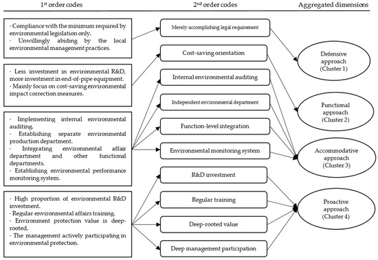 As four kinds of green governance contexts are presented and validated in Section 4.3, we note that the sample MNEs adopted different response patterns under different green governance contexts. Previous studies have shown that MNEs usually adopt different environmental approaches under different regulatory situations [79,80]. However, most of these studies only consider the “pull” effects from stakeholders and overlook the “push” effects from the firms themselves. We aggregated these record manuscripts into four clusters and classified them as the defensive approach, functional approach, accommodative approach, and proactive approach, indicating the four different types of green governance response patterns. Each of these patterns represents a specific configuration of both the motives linking profit-maximization and risk calculations to a longer-term normative sustainability agenda and the allocation of internal resources to achieve them. Figure 5 provides an overview of our data structure.