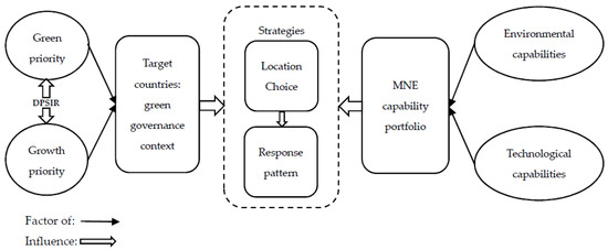 The green governance context is complex and commonly state-linked [1,21]. These governance contexts constitute and define an established order within which businesses operate. Contingency theory emphasizes that firms’ strategies need to be aligned with internal capabilities and external contexts [22]. Recent studies from advanced economies’ MNEs (AMNEs) have recognized that both contextual and firm-specific factors help explain international diversification. However, less attention has been given to the internal and external factors of EMNEs’ IB strategies in different green governance contexts. Despite their increasing importance as globalization advances, there remain significant gaps in our understanding of the “fit” between their strategies and capabilities in the external green governance context. Filling this gap is important, partly because of the substantial increase in global expansion by MNEs from China, India, and Brazil, but principally because the lessons and their supporting evidence for multinationals from advanced economies may not be directly applicable to EMNEs [23]. EMNEs often face deficits in both capability and legitimacy [24,25]. Their investment and operations in foreign countries more easily draw greater public concern about and governmental scrutiny of their environmental impacts [26,27]. Thus, EMNEs, especially those penetrating advanced economies, face significant challenges in their attempt to adapt to the green governance context. However, firms have specific capabilities that can be developed and deployed to enable their proactive preparation to harness opportunities and mitigate threats [28]. Consequently, this study aims to investigate how different green governance contexts and firms’ specific capabilities influence EMNEs’ IB strategies. Explicitly, this study investigates the following four questions: