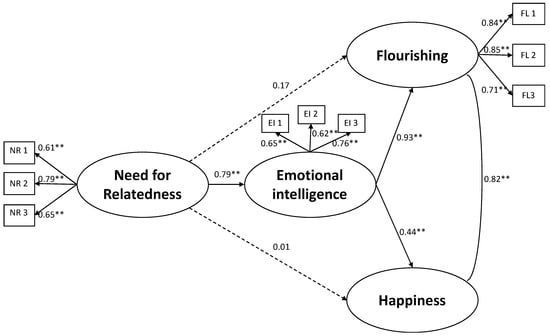 Mediation model of Emotional intelligence in the relationship between Need for Relatedness and both Flourishing and Happiness with standardized path coefficients. Discontinuous lines mean non-significant relationships. Note. * p < 0.05; ** p < 0.01.