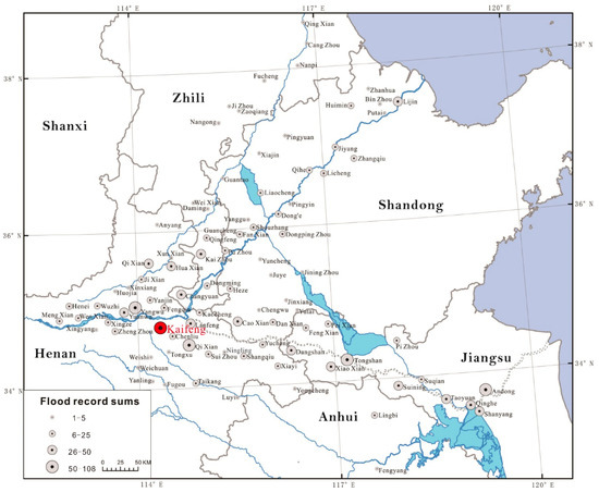 Locations and frequencies of flood events in the lower Yellow River. The base map is from the Harvard database https://doi.org/10.7910/DVN/Q9VOF5. The data in the figure is from References [,].