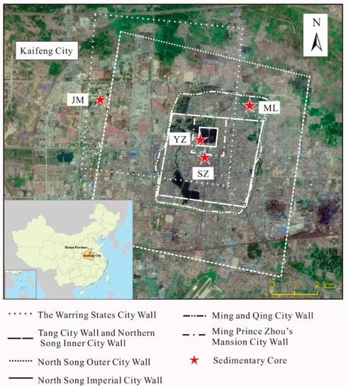 The sedimentary environments in different areas of Kaifeng may display significant differences due to a range of factors including variations of levees protection, flood intensities and terrain differences, therefore, the selection of representative sites is crucial. The core sites were located cognizant that: (i) the cultural layer should embody all cultural layers from the Warring States to the present time, reflecting the overall spectacle of the “city overlap city” landscape; (ii) the inhomogeneous sedimentary environments indicate that the core sites should be located along the major flood-path trend (i.e., from northwest to southeast). Based on these premises, three sedimentary cores (designated as ML, SZ and YZ) from the urban area together with one core (JM) from the suburbs were acquired through the deployment of a drilling machine (Figure 3).