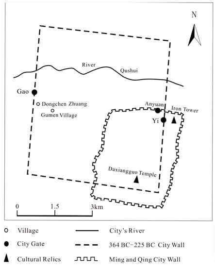The outer city wall of Kaifeng during the Warring States Period was almost square. Only two gates have been confirmed: Yi in the eastern wall and Gao in the western wall. The River Qushui crossed the northern part of the city [,].