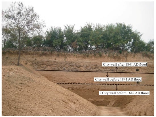 In China, there are also many unique urban areas, similar to “Pompeii”, forming what is known as a “city overlap city” landscape because in different historical periods, cities have been built successively in the same area under the influence of natural and social factors, and there is an obvious vertical overlapping phenomenon. Several cities including Kaifeng, Shangqiu, Xuzhou, and Xiapi, which are located in the Yellow River floodplain, characteristically exhibit this special urban landscape phenomenon which was essentially produced through flooding of the Yellow River in the historical period [,,,]. Among these cities, Kaifeng city, the only provincial city in the Yellow River floodplain, has suffered the most from Yellow River floods; for instance, it has been destroyed several times throughout history. Although these cities and their relationship to the Yellow River can be considered to be highly relevant in research on the impact of environmental change, especially concerning human coping mechanisms, research in this area has hitherto been limited to mere “landscape descriptions” and, therefore, little is known about the region’s stratigraphic characteristics. This limitation is generally regarded as being related to the fact that the floodplain in the lower reaches of the Yellow River is in an economically underdeveloped region, and consequently, the government, as well as most other sectors of society, is not sufficiently aware of the natural and human heritage intrinsic to these unique cities and the region.