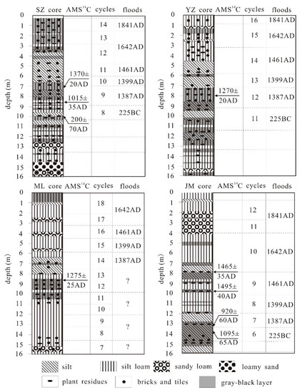 In April 2012, the four 25 m-long cores (ML, SZ, YZ and JM) were obtained through the use of a corer and large drill in open air. They were then sampled continuously, mostly at 10 cm intervals with a few sandy samples at 20 cm or 30 cm intervals. A total of 861 samples were finally acquired, comprising 213 samples from SZ, 223 from YZ, 204 from ML, and 221 from JM. All samples were subjected to laboratory investigation which included grain size analysis, black carbon (BC) content analysis, and chemical elements (Cu, Zn, Pb, Cd, Al, P, As and Hg) content analysis to classify the various sedimentary cycles (representing flood events). Grain sizes were measured using a laser diffraction particle size analyzer (Mastersizer 3000, Malvern Co. Ltd., Malvern, UK). The black carbon content was measured using a TOC analyzer (Liqui II, Elementar Co. Ltd., Hanau, Germany); whilst the content of other chemical elements were measured using an ICP-MS (Xseries-2, Thermofisher Co. Ltd., Waltham, USA).