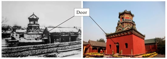 Comparison of the Yanqing Taoist temple before and after the 1841 AD flood which resulted in the lifting of the ground surface by some 3.1 m. The photograph on the right was taken in 2009.