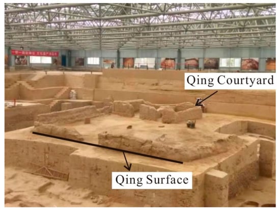 This Yellow River flood overflowed from the South Gate with flood waters proceeding northward from east to west, converging in the north of Longting Pavilion, resulting in serious water accumulations in some parts of the city [,]. It was not until February 8, 1842 AD that the closure of the Yellow River’s breached embankment was completed. The flood between Kaifeng brick city and the moat and the accumulated water in the city gradually subsided, but the city was besieged by floods for eight months. This Yellow River flood did not cover the whole city, so Kaifeng city was not completely buried underground. For example, the ML core which is located in Gongyuan of Henan Province, showed no signs of deposits from this flood, whilst the deposits in SZ and YZ cores are not too thick, being less than 1 m. The surface of Kaifeng city therefore comprises the upper parts of the sediment layers from both the 1642 AD and 1841 AD Yellow River floods. Nowadays, the surface of the Xiangguo temple and the Yanqing Taoist temple before the whole uplift is higher than that of its base (Figure 11). However, the flood besieged Kaifeng for 8 months, and deposited a large amount of sediment between the outside of the brick city and the moat, as evidenced in the JM core, where the corresponding sedimentary thickness is 3.2 m. This is basically the same as the burial depth of the two Qing dynasty courtyards at the Xinzheng Gate site (Figure 12).