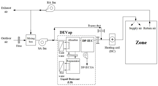 - Shin, J.H.; Park, J.Y.; Jo, M.S.; Jeong, J.W. Impact of Heat Pump-Driven Liquid Desiccant Dehumidification on the Energy Performance of an Evaporative Cooling-Assisted Air Conditioning System. Energies 2018, 11, 345. [Google Scholar] [CrossRef]