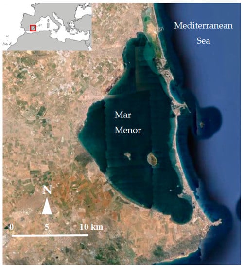 The Mar Menor is a salt lagoon of 170 km2 located on the Spanish Mediterranean coast (Figure 1). It is separated from the Mediterranean Sea by an old dune strip, which allows the exchange of water only through five natural channels called golas []. This configuration gives it a hypersaline character that has generated a valuable ecosystem with crystal clear waters. This enables abundant marine fauna and flora to flourish, with singular species such as Pinna nobilis (the largest bivalve mollusk in the Mediterranean Sea) or autochthonous variants of the hippocampus.