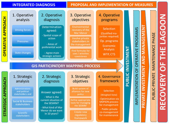 The first phase develops an integrated diagnosis that must be able to involve all stakeholders and determines all the issues that affect the current situation of the lagoon in a hierarchical manner. The second phase focuses on the proposal of measures and their implementation in the short, medium, and long-term in a coordinated manner through the establishment of a governance framework for the Mar Menor. Both phases are, in turn, developed under two approaches that run in parallel: a more operational and a strategic approach. The backbone of this biphasic procedure is the so-called GIS participatory mapping process. This concept allows us to diagnose, analyze, and propose measures based on the objective and detailed spatial information provided by the GIS indicators. The framework facilitates reaching agreements and a technical-social consensus among the different stakeholders.