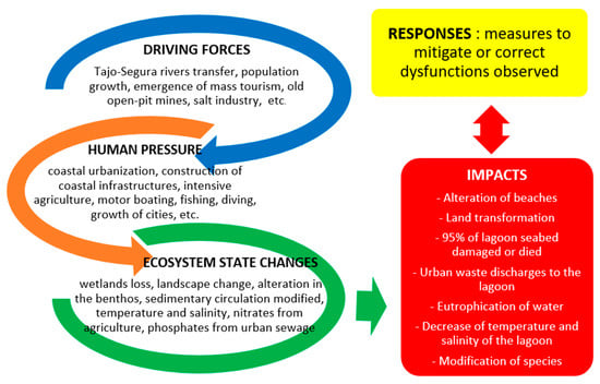 In the first place, the so-called Socio-Ecological System of the Mar Menor (hereinafter SESMM) must be configured to develop a decision panel formed by the legitimated stakeholders. Given that the situation of the Mar Menor goes beyond mere environmental problems, it is necessary to establish a framework that approaches the situation from a multidisciplinary focus in which it is possible to involve all stakeholders. Stakeholders have been selected following a DPSIR (Driving forces, Pressure, State, Impact, and Response) model [] (Figure 3).