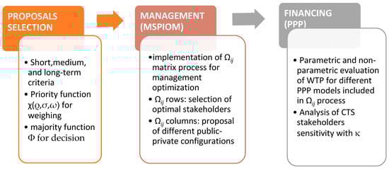 The operational programs must take into account which stakeholders should manage their execution by using a Ω matrix selective process of implementation for optimal management (MSPIOM). The matrix will select stakeholders responsible for the process by taking into account factors such as the degree of responsibility of the agent who generated the problem in which the stakeholder is the most qualified for the implementation and correct maintenance of operational programs, or what each stakeholder’s competence at the administrative and legal level is. The list of possible stakeholders’ participation will be crossed with different models of public-private configuration of the process by configuring the Ωij matrix. These models will calibrate private participation at different stages of the process of the lagoon recovery (i.e., main/secondary/short-term/long-term, etc. investments, management/maintenance/exploitation, etc. costs, or other features, all of which are design parameters of the specific case study).