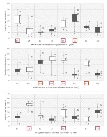 The solutions are proposed by stakeholders and grouped into various operational programs to differentiate those that can be implemented in the short, medium, or long-term. In this sense, it is important to combine measures from the three groups in a balanced way. On the one hand, administrations may find it difficult to address an excessive number of short-term measures economically, and may generate tensions with affected stakeholders. Conversely, an excessive number of very ambitious but long-term measures can convey to citizens the feeling that nothing is being done and it can expose the recovery plan’s execution to future political swings in the administration or the impact of inevitable economic cycles. The measures proposed were previously validated by the SESMM by means of a majority function and, subsequently, selected by a function of priority χ that takes into account the importance, urgency, and motricity criteria for each proposal, according to Formula (4).