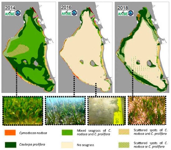 An intense phenomenon of eutrophication in the lagoon bloomed in the summer of 2015, which transformed the traditionally crystal-clear waters into a greener color. The turbidity of the water meant that the level of visibility, always surpassing at least two meters in the lagoon, did not even reach 10 centimeters (see Supplementary Materials). This loss in transparency of the water prevented the sunlight from reaching the seabed, whose vegetation cover almost completely died in just one year. The phenomenon, which was accompanied by the disappearance of the jellyfish population, caused a major social alarm. The situation, aside from the environmental issues, generates heavy economic losses for tourism through the loss of the blue flags on all beaches since 2016.