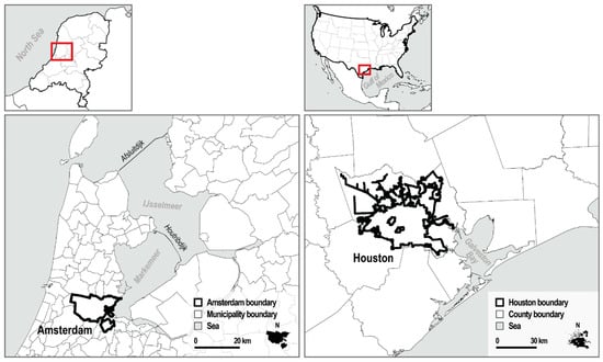To justify the efficacy of land use plan and flood protection for future flood risks, this study examines coastal cities whose population is increasing. Amsterdam in the Netherlands with a legally binding land use plan prepared by the local government [65] and Houston in the US with no city comprehensive plan are used for comparative purposes. Amsterdam is the capital city of the Netherlands, located in the province of North-Holland. The area is 196.9 km2. The city population is predicted to grow from 790,110 in 2012 to 869,808 in 2040 [66]. Houston is located on the Gulf of Mexico coastline, and the land areas is 1733.3 km2. The Texas Water Development Board [67] forecasts that the Houston population will catapult from 2,240,974 in 2010 to 3,073,268 by 2040.