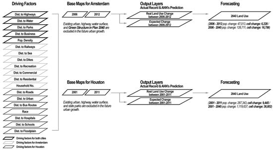 For base maps, Amsterdam uses 2006 and 2010 land use shapefile data, and Houston uses 2001 and 2011 land cover raster data from the US Geographical Survey, due to data availability. After running the LTM prediction for 2011, the expected changes are compared to the real land use changes in the output layers stages. Then, the highest matching cycle is selected to predict future land use 2040 according to the ratio of pixels to the estimated population referred as forecasting.