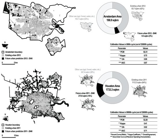 As shown in Figure 3, forecasted model calibration outputs are measured to validate the accuracy of the prediction model; PCM: 82%, Kappa Statistic: 75%, OA: 89%, and Area Under the ROC Curve: 87%. All calibration levels show a very good level of prediction in Amsterdam. Houston calibration outputs show PCM: 52%, Kappa: 41%, OA: 82%, and Area under the ROC Curve: 71% with all an acceptable or good level of prediction. The reason for the slightly lower calibration outputs in Houston, may be due to the fit of driving factors and the prediction scale. There, of course, could exist other factors contributing to future urban growth that may not have been available spatially. However, the differences are minimal in both models and each model proved to be fit for predicting according to the series of proven calibration methods used. The prediction scale closely relates to the ratio between predicting pixel and population pixel numbers; Amsterdam predicts 6228 urban pixels out of 126,711 population pixels between 2006 and 2012, and Houston predicts 9445 urban pixels out of 1,119,637 population between 2001 and 2011. The 90,000-person projected population increase [66] in Amsterdam would cause urban growth primarily the western periphery of the city. The increased urban areas between 2012 and 2040 would be 9.6 km2, 5% of the total Amsterdam area. The over 832,000-person population increase [67] between 2010 and 2040 in Houston would expand urban area mainly in the south-east portion of the city and the suburban areas closer to the urban edge. The increase in urban areas projects to be 273.6 km2, 16% of the total Houston area.