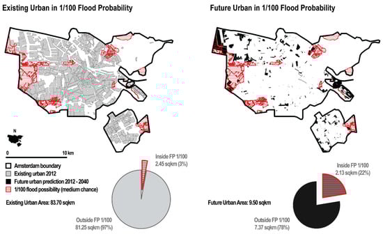 There are three salient findings when comparing the two cities. First, Houston has already placed too much urban development within the current flood-prone zone, compared to Amsterdam. When comparing existing urban areas, only 1.3% (2.5 km2) of Amsterdam, is under a 1/100 flood risk, but 9.6% (166.7 km2) of Houston is under the 100-year floodplain. Also, when considering future urban growth by 2040 in Houston, flood-prone areas would increase to 217.12 km2 under the 100-year floodplain. This number raises to 228.48 km2 under a 3ft SLR scenario, and 254.3 km2 under a 6ft SLR scenario. Political circumstances in Houston requiring no zoning regulations promote low density sprawl and limited flood protection infrastructure in Houston [74]. If the current development patterns continue, more new development would be within the flood risk area as predicted (Figure 5).