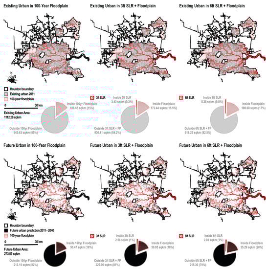 While this research takes an important step to analyze both future urban prediction and flood risk, further research is still needed on flood risk estimation and urban areas exposed to flood risk. We used the current 100-year floodplain and 3ft and 6ft SLRs scenarios provided by NOAA to identify future flood risk zones. If future increased impervious surfaces are integrated within the SLR floodplain prediction, a much larger urban land area amount could be within the enlarged floodplain [78]. As Gori et al.’s urbanization and hydrologic study in Houston, TX shows, land change has increased surface run-off, and future urban growth will expand the future 100-year floodplain by 12.5% in 2050 [147]. For a more accurate risk analysis, future studies need to consider an updated floodplain based on the predicted urban growth. In the future impact calculation, the result shows potential future damaged urban area and location exposed to future flood risks. This does not mean that all the identified areas will be flooded in the future. It only shows risk of flooding. Depending on preparation of plan policies and other flood protection measures, the results could differ.