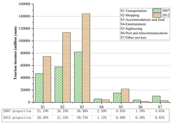 Figure 2. Generally, Beijing’s tourism income exhibited an upward trend, increasing from approximately 221,401.01 million yuan in 2007 to 362,635.63 million yuan in 2012, with a growth rate above 63%. The possible reason might lie in the optimization and adjustment of the tourism industry structure in Beijing during the period of the 11th Five-Year Plan. Expanding tourist expenditures in the tourism sectors with a large demand elasticity (such as the accommodation and foods (S3), shopping (S2), and transportation (S1) sectors) will contribute to the structural optimization and efficient economic growth of the tourism industry in Beijing.