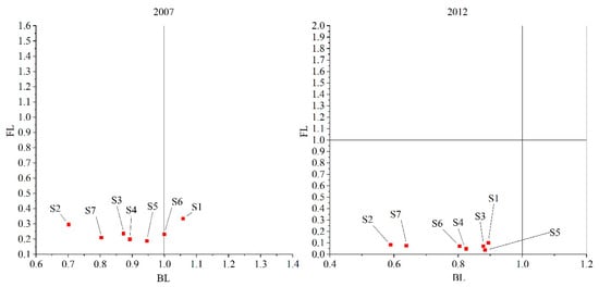 Interestingly, there is no tourism sector of the Beijing economy in the group that is relatively dependent on the others (upper right quadrant) or dependent on inter-industry demand (upper left quadrant) for 2007 and 2012. In particular, in 2007 and 2012, as shown in the area of the lower left quadrant of