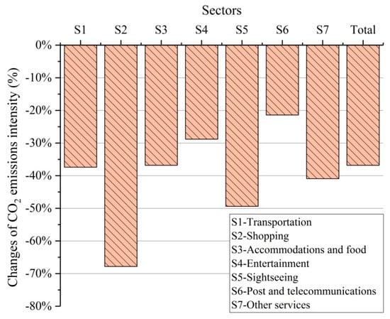 2 emissions intensity of all the sectors declined at a rate above 20% from 2007 to 2012, especially the shopping (S2) and sightseeing (S5) sectors, with decrement rates of approximately 68% and 49%, respectively, becoming the major sectors largely affecting the total emissions intensity of the tourism industry. This result implies that during 2007–2012, the economic growth rate of the tourism sectors in Beijing exceeded that of the CO