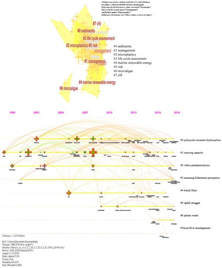 CiteSpace was used to construct a network of co-cited references, see Figure 1, which revealed the relevance among papers. In this network, the first massive cluster was named “#0sediments”, followed by the second, named “#1management”, and the third, named “#2microplastics”. Furthermore, the timeline view of these clusters is shown in Figure 1.