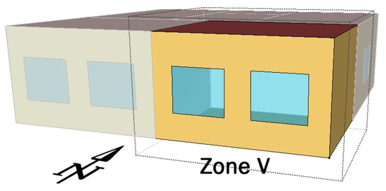The whole floor was divided into five parts which were simulated as separate thermal zones. The southern zone of the building has the greatest potential for solar energy gains to support the heating system during the winter. However, the risk of overheating during summer or even during transitional periods is considerably greater in this zone than in the case of any other parts of the building. This is why only simulation results for the southeast zone will be discussed further, Figure 1. The floor area of Zone V is 20 m2 and the ratio of the south glazing area to the floor area is equal to 17.2%.