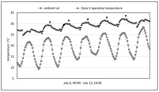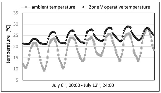Figure 3. External air temperature and internal operative temperature in Zone V; reference building with air change rate equal to 5 h−1 during working hours (07:00–17:00) and 0.5 h−1 during the night.
