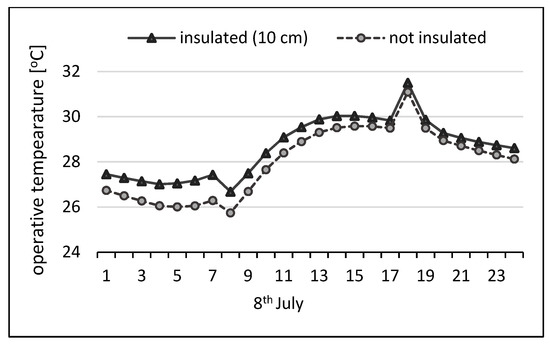 As could be expected, in the case of the chosen hot day and the assumed building operation mode, operative temperature is constantly higher in the insulated building. Total daily difference is equal to 15.43 degree hours. However, it should be emphasized that a lack of insulation does not ensure thermal comfort in this space. Conductive heat transfer is not enough to discharge the collected energy. The irregular shape of the curves is the result of abrupt changes of ventilation intensity at 07:00 and 17:00.