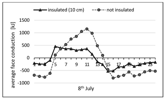 Figure 5. Average (internal and external) face conduction heat transfer for the insulated and noninsulated wall on 8th July.