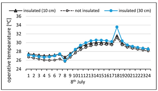 Figure 4. Operative temperature in Zone V with reference external wall and noninsulated wall, 8th July.