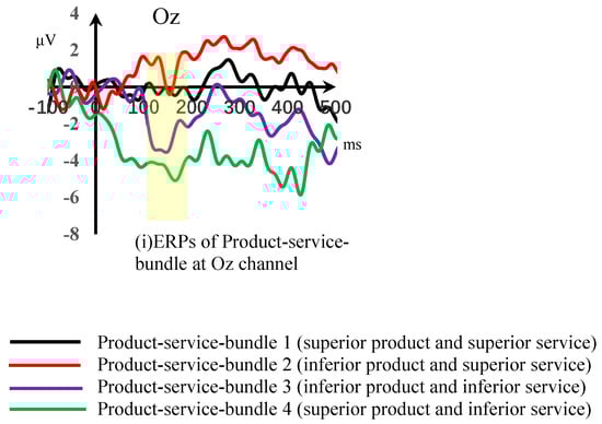 The N170 (latency of 130–200 ms) was elicited for each product–service bundle stimulus. The brain topography at 170 ms has been presented in Figure 2 (a versus b; c versus d), including the channels related with cognition processing. Figure 3 shows the grand-averaged ERP waveforms of the PSS with the different product and service contents (Product–Service Bundle 1: superior product attributes and superior service level, Product–Service Bundle 2: inferior product attributes and superior service level; Product–Service Bundle 3: inferior product attributes and inferior service level, and Product–Service Bundle 4: superior product attributes and inferior service level) in the parietal-occipital (POz, PO3, and PO4), parietal (Pz, P1, and P2), and occipital (Oz, O1, O2) channels. We compare the grand-averaged ERP waveforms of the product–service bundle with the comparison of Product–Service Bundle 1 and Product–Service Bundle 2, and the grand-averaged ERP waveforms of the product–service bundle with the comparison of Product–Service Bundle 3 and Product–Service Bundle 4.