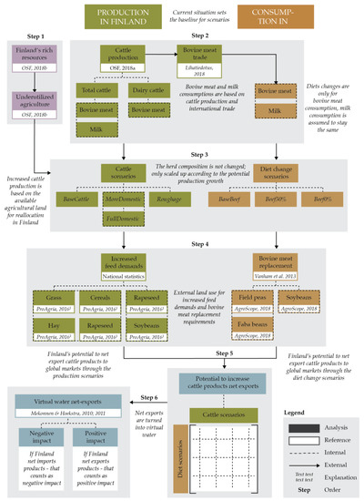 Flowchart of the study. Finland’s vast and underused natural resources create the baseline for this study (Step 1). The calculation is divided into separate assessments of cattle production and cattle products consumption in Finland (Steps 2–4). Cattle production and feed use scenarios are combined (Step 5) and turned into virtual water to calculate the potential net exports (Step 6). 1 Data for ProAgria is based on a personal communication with professor A. Huuskonen (Natural Resources Institute Finland) and researcher O. Niskanen (Natural Resources Institute Finland) 16 June 2016 [48].