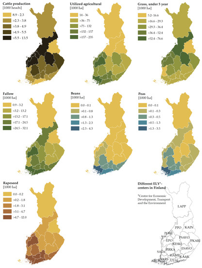 Finland is a large country that is sparsely populated. Figure 2 presents the current cattle production areas and the agricultural land uses in Finland, relevant to our study [50,52]. Cattle production is focused in the western and middle regions of the country, where the landscape is mainly plains. The utilized agricultural land for feed production is focused in the southern and western parts of the country. Leys and fallows are focused in the same areas as cattle production, meaning that the majority of the feed is close to cattle production. However, farmers’ decision-making for chosen crops and animal numbers is based on market prices and agricultural policies, which were not part of our assessment.