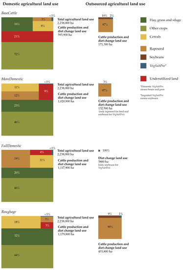 Land use for different cattle production scenarios. The domestic part of the analysis demonstrates how the different cattle feed and VegSubPro requirements change the land use (with the total land use being constant at 2,238,000 ha and the ‘other crops’ specify the other agricultural production). The outsourced land use assessment presents how much external land use the cattle feed and VegSubPro imports require. Due to the rounding, not all percentages add up to 100%.