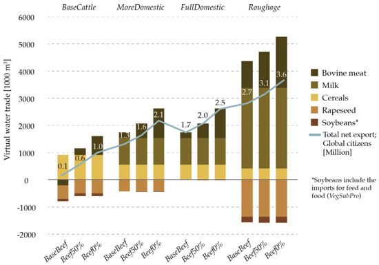 When solely looking at the trade of virtual water, it can be seen that only FullDomestic does not consume global water resources (apart for the soybeans imports in the VegSubPro), because the share of domestic feed has a high impact on virtual water net exports. The production of cattle products is the same in both MoreDomestic and FullDomestic, but as domestic feed has a higher share in FullDomestic (Figure 4), it also leads to a higher virtual water net export potential.