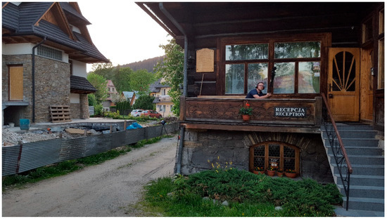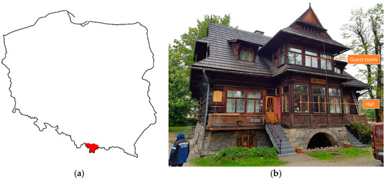 (a) location of Podhale on the map of Poland; (b) example of regional architecture—constructed using brick and wood technology and functioning as a hostel.