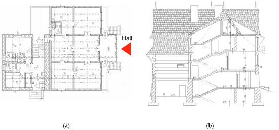 The ‘Stara Polana’ building is located in the centre of Zakopane. The building is owned by Cracow University of Technology; it is currently being used as a hostel. The building is located among low buildings on the main road through Zakopane: Nowotarska Street. This is a historic building, a villa in the Witkiewicz style, which was built in 1905 for the Płaza family by the builder Jan Ustupski-Kubecek. The condition of the building qualifies it for thorough renovation and thermo-modernisation. A detailed description of the building is provided in work [20]. Figure 2a shows a horizontal cross-section of the building. Figure 2b shows the vertical cross-section of the building.