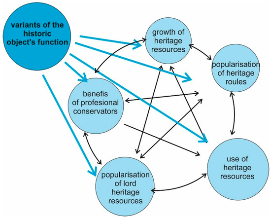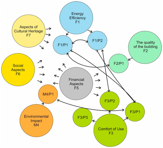 One should pay attention to the interdependence of some proposed criteria for the selection of the utility function of a historic building. These dependencies can be linear as well as nonlinear. It is necessary to take into account interdependencies (e.g., so-called feedback) between these criteria. This leads to the adoption of the network nature of links between them. In Figure 3, network nodes symbolize the criterion data and the potential relationships between them are determined by arrows (arcs). The size (diameter) of nodes symbolizes the significance of a given criterion in the system.