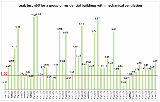 Figure 5 presents the results of tests for 48 buildings with mechanical ventilation. According to [7], the n50 coefficient should be n50 ≤ 1.5 [1/h].