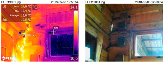 For the ‘Stara Polana’ building, the result of the tightness test for negative pressure n50 = 10.09 [1/h] and for overpressure n50 = 8.83 (1/h) was achieved. Figure 7 presents a thermal image taken inside the building.