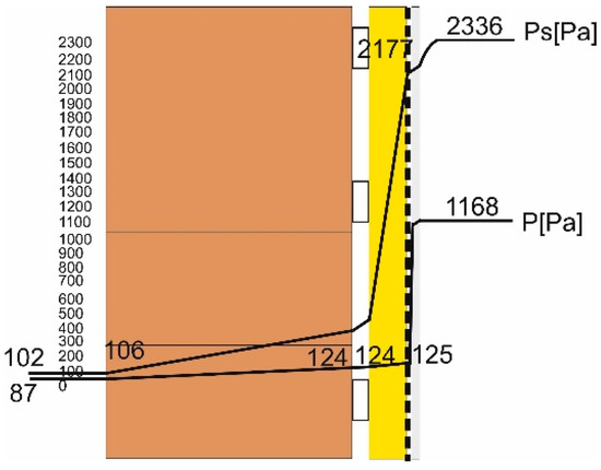 The result of the tightness test is significantly different from the value of the proposed classes; this is due to the unsealing of wooden walls and connections. After well-performed insulation, the values proposed in the classes can be achieved. Obtaining the tightness of the building envelope is associated with the minimisation of energy consumption for heating purposes. An example of how to properly insulate a historic building from the inside is presented in Figure 8. The Figure 8 shows the correct insulation of the walls of historic buildings. The graph shows the pressure diagram of saturated steam and the water vapour pressure diagram. These are pressure graphs, therefore, the unit is Pa. The lines do not intersect. The wall will not condense water vapor. The thermal insulation is done correctly.