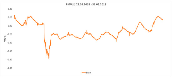 Providing the appropriate thermal comfort in NZEB buildings as well as those subjected to thermo-modernisation is one of the most important elements in designing and constructing buildings. Both room overheating and cooling are subjects of research and analysis performed in low-energy and passive buildings [37,38,39]. Thermal comfort is also affected by design errors, such as leaks in the building envelope, thermal bridges, and unevenly heated surfaces. The PN-EN ISO 7730 [27] standard introduces a division into room categories on the basis of the achieved PMV factor. The classes are presented in Table 5.