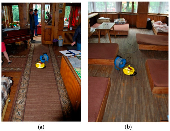 The tightness test on the ‘Stara Polana’ building was performed according to the standard [24] using the pressure measurement method with the use of a fan; it was performed using a system for testing the air tightness of the building envelope by means of the generated Retrotec Q5E pressure system with a capacity of 14,100 m3/h at 50 Pa. The test was carried out at 1:00 p.m. on 8 May 2018 under the following weather conditions: barometric pressure: 91.95 kPa, wind force 3 (light breeze), external temperature 15 °C, internal temperature 19 °C. The building’s cubic capacity is 2119.63 m3, Figure 6 shows the method of performing the tightness test in the ‘Stara Polana’ building.
