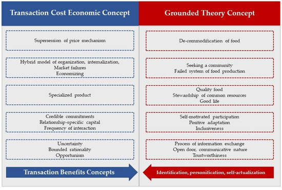 Schematic of relationships between concepts from Transaction Cost Economics (TCE), the Grounded Theory developed and Transaction Benefits. Source: Authors’ own elaboration based on TCE [10,11,12,13,14,15,16,24,25,26].