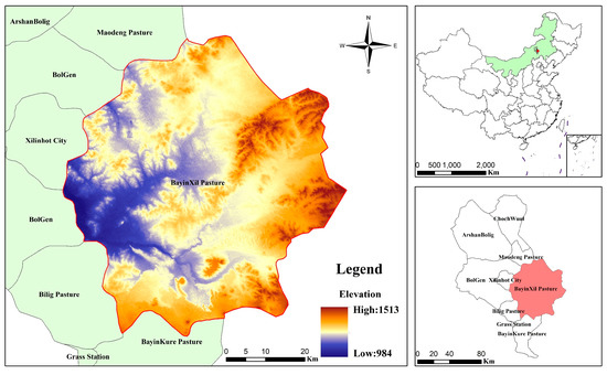 Bayinxile is the western part of Xilinhot, Inner Mongolia, China (43°02′–44°52′ N, 115°18′–117°06′ E), and is the core area of the Xilingol steppe nature reserve (Figure 1). It is located in the mid-latitude westerly airflow belt, with atypical semiarid continental climate in the middle temperate zone. Average annual precipitation is 294.9 mm with a frost-free period of 110 d. The total area of Bayinxile is 3555 km2, with the main land type being rangeland, which mainly consists of warm steppe varieties. The dominant species, Stipa, is widely distributed, with a small area of lowland meadow in the southeast. The terrain declines from east to west being flat in the middle and west, and hilly in the southeast. It has an altitude of 1513 m at the highest point, 984 m in the lowest level with an average altitude of 1150 m.
