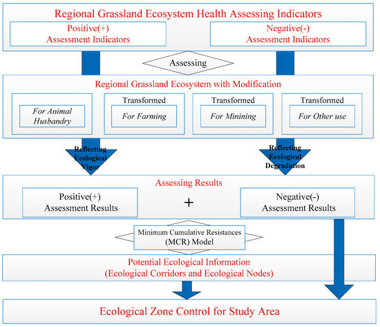 The process carried out in this study, “building an assessment system—assessing grassland health—identifying the potential ecological information—making proposal for ecological zone control”, is shown in Figure 2. We classified the selected indicators into positive and negative assessment categories. Positive assessment was to reflect the vigor of the grassland ecosystem, and negative assessment was to reflect the degradation processes of the study area. The positive and negative assessment results were obtained respectively by weighted overlapping corresponding index layers, and then final assessment result was found through overlapping the above assessment results. To improve the applicability of the assessment results, we introduced the MCR model to extract the potential ecological information of the study area as a supplementary reference for formulating the ecological management strategy.
