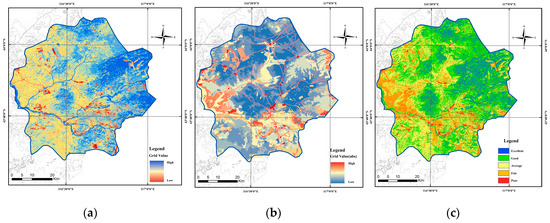 As shown in Figure 4a, there was a significant difference between the east and the west with regards to the intensity of vigor. In the eastern hilly area, due to good performance on vegetation biomass and other indicators, its positive assessment value was significantly higher than that of other regions, while in the west, because of grassland degradation, vigor was low on the whole. It also indicated that the river is like an ecological network that runs through the study area with prominent ecological vigor and the farmland was outstanding because of its high productivity. The dynamic of construction land, including roads, villages, mining areas, etc., was lowest in the whole area. The negative assessment result was a response to ecosystem health at the level of natural succession. From Figure 4b, it can be concluded that the areas with high values were mainly distributed around the river and the areas where human activities were concentrated, such as farmland and villages. It can be observed that the distribution of roads had a great negative impact on the connectivity between vegetation communities. From Figure 4c, the health assessment result of Bayinxile, it can be seen that the vigorous areas were mainly distributed in the northeastern and middle part of the study area. The poor health areas were mainly located in the western and southern part of the study area and distributed along both sides of the river. It also shows that the assessment result of farmland was average and the area around the both sides of the river was lower than that of other areas.